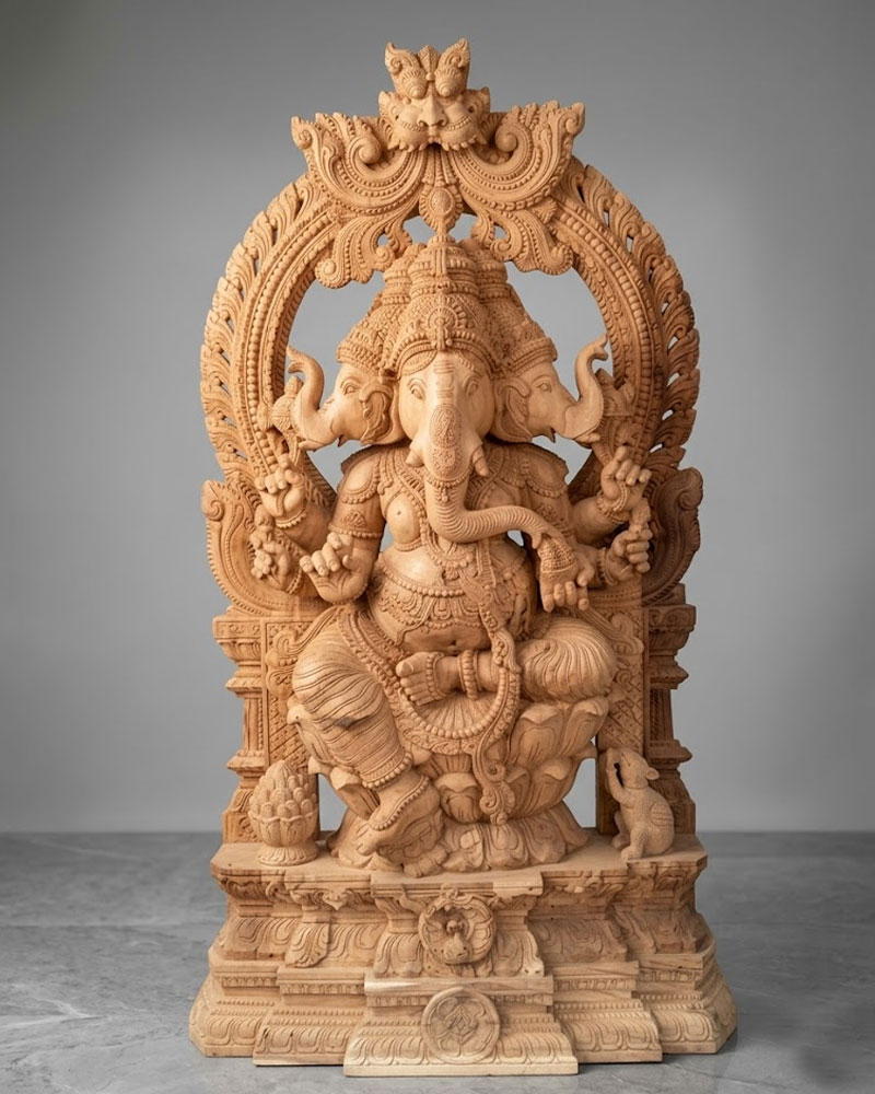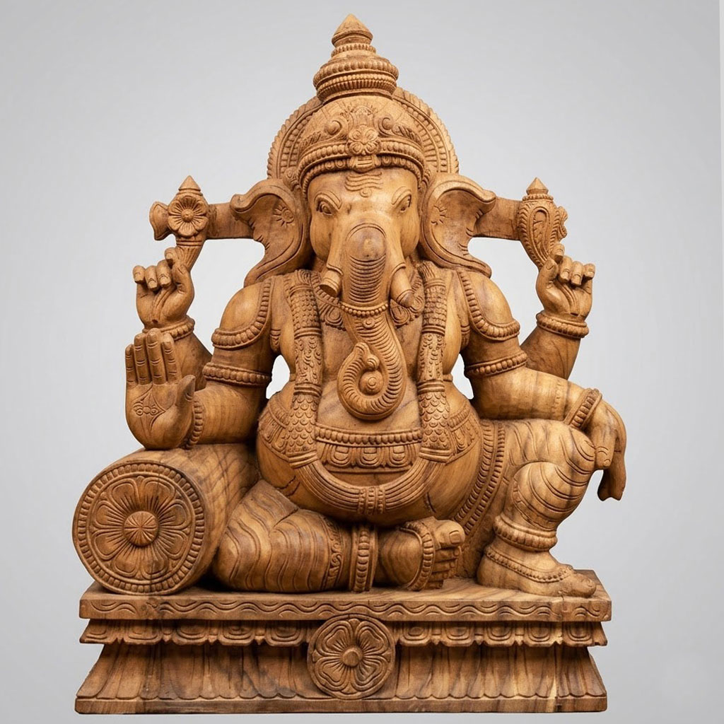 Our wooden statues are carefully carved by skilled artisans who bring traditional artistry and precision to every piece. From divine figures to decorative sculptures, each statue showcases fine detailing and expressive craftsmanship, making it a beautiful addition to pooja mandirs, homes, and commercial spaces seeking a touch of cultural elegance.